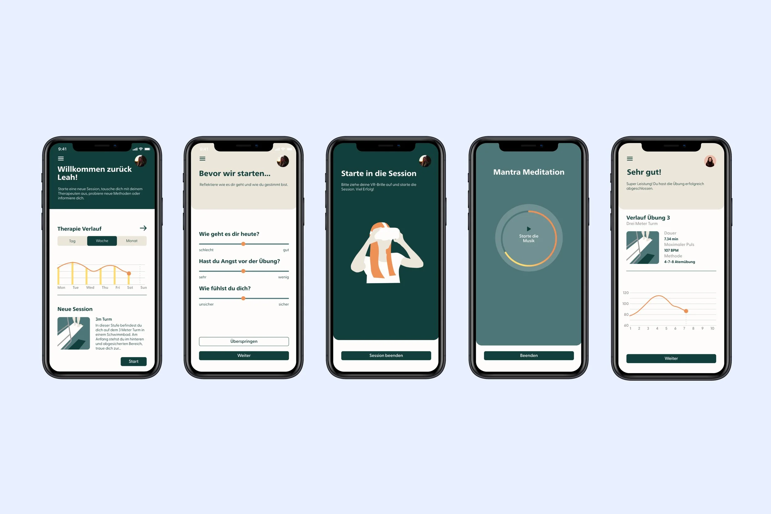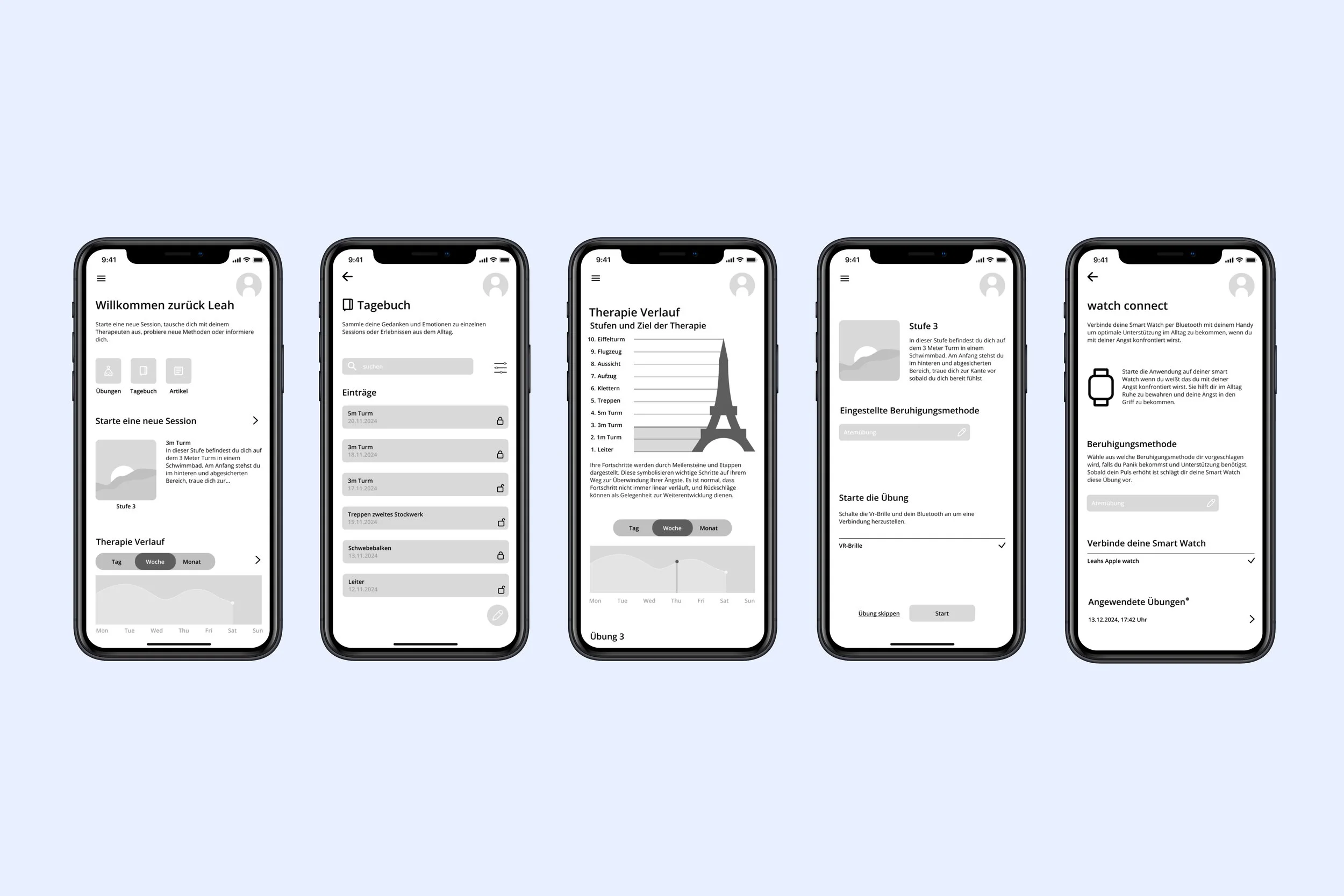After outlining the course of the therapy, we started with the "Crazy 8" method to collect ideas on how we could visualize the content. Afterwards, we converted these ideas into wireframes where we structured and visualized the content. Our concept idea comprises six central elements that we integrated into our app. These include the option to document therapy sessions and various exercises. Furthermore, the app allows users to write diary entries and obtain a comprehensive overview of their therapy progress. Finally, we offer the option of reading articles from other people affected and an integration of the user's Apple Watch.