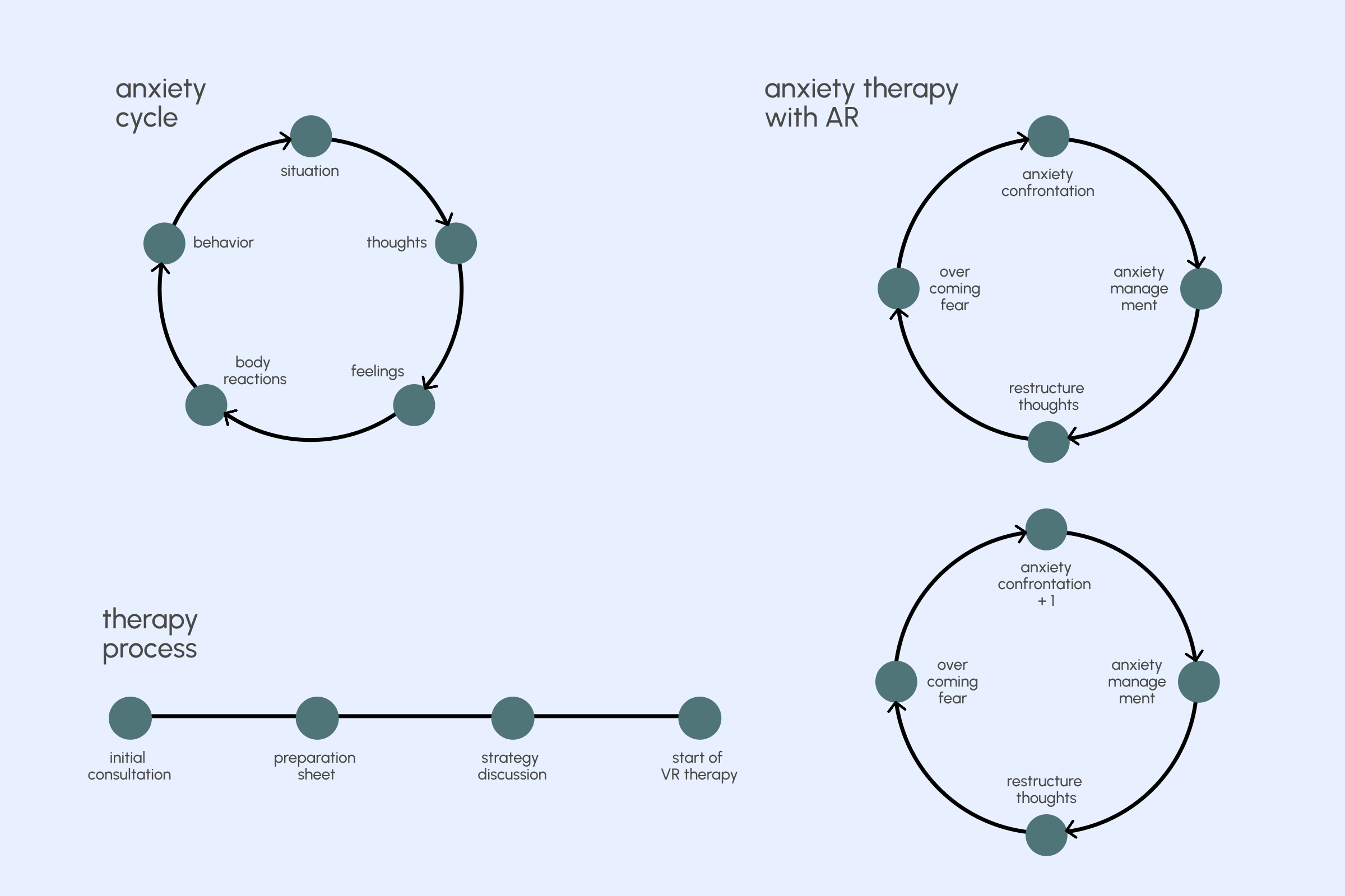 In order to better understand and illustrate the entire therapy process, we outlined a so-called anxiety cycle. Within this cycle, a given situation first gives rise to thoughts, which are then followed by feelings. These feelings then manifest themselves in physical reactions, which lead to certain behaviors. In the context of anxiety therapy with VR glasses, the patient confronts their anxiety directly. The next step is to overcome the anxiety by using techniques such as autogenic training or progressive muscle relaxation. The thoughts are then restructured, which leads to overcoming the fear. This process is repeated until the trauma has been successfully overcome.