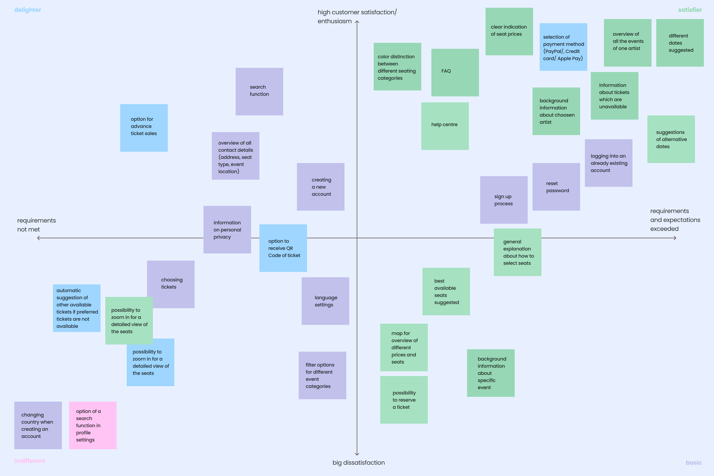 In the following phase, we categorized the functions and features according to relevance for the user and need for optimization by using the Kano model and prioritized the requirements, development tasks and customer wishes. The Kano model, represented in a qualitative coordinate system, assessed customer satisfaction and the fulfillment of expectations for each function. We highlighted basic functions such as the search function and registration in blue, satisfactory functions such as ticket reservation and background information on the event in green, enjoyable functions such as QR code reception and seat enlargement in yellow and dangerous functions such as the difficulty of choosing a seat in red. Additionally, we highlighted potential opportunities for new features in purple, such as a list of previous ticket purchases or ticket resale options. After prioritization, an order of precedence emerged for retaining, revising and integrating features into our app.