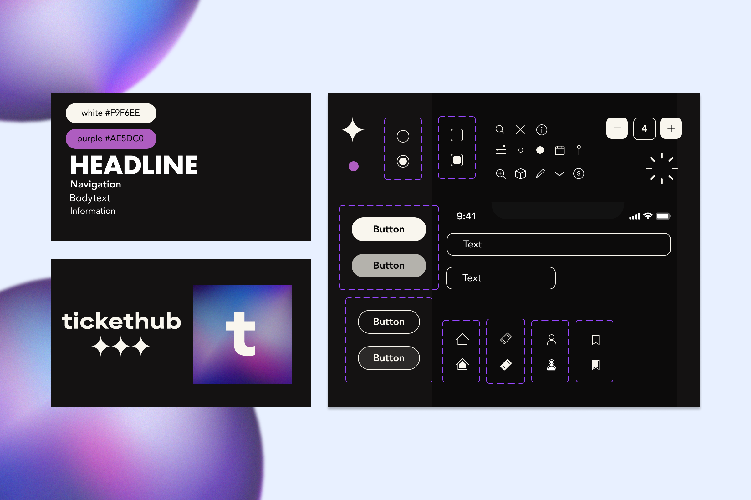 To create a visually engaging design for our event and ticket sales app, we chose vibrant purple and pink tones for background circles to evoke creativity, energy, and entertainment. For typography, we selected the modern Futura in bold for headlines and the clear, legible Avenir Roman for body text. Our button hierarchy includes primary, secondary, and tertiary options, all styled with minimalist Radix Icons to fit our app's magical theme. Additionally, we rebranded the app from Ticketmaster to Tickethub, incorporating a star symbol in the new logo to inspire and complement the retro design elements.