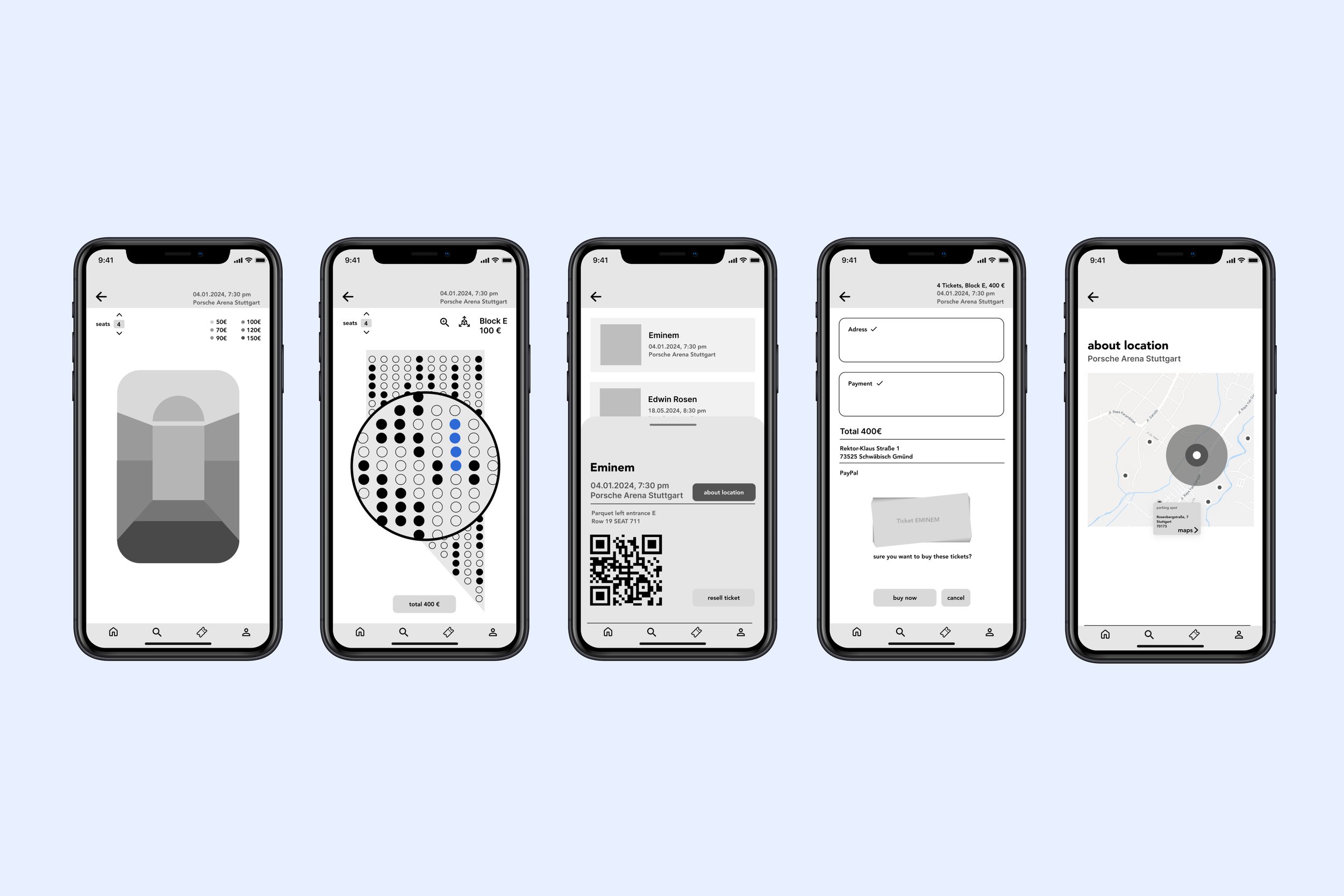and design approach. These questions aimed to turn insights into opportunities and develop innovative solutions. The first question focused on improving the clarity of seat selection for different price categories, while the second question explored the implementation of a new feature based on high demand that allows ticket buyers to resell tickets in case of illness. The third question related to ensuring personalized event recommendations on the home screen.