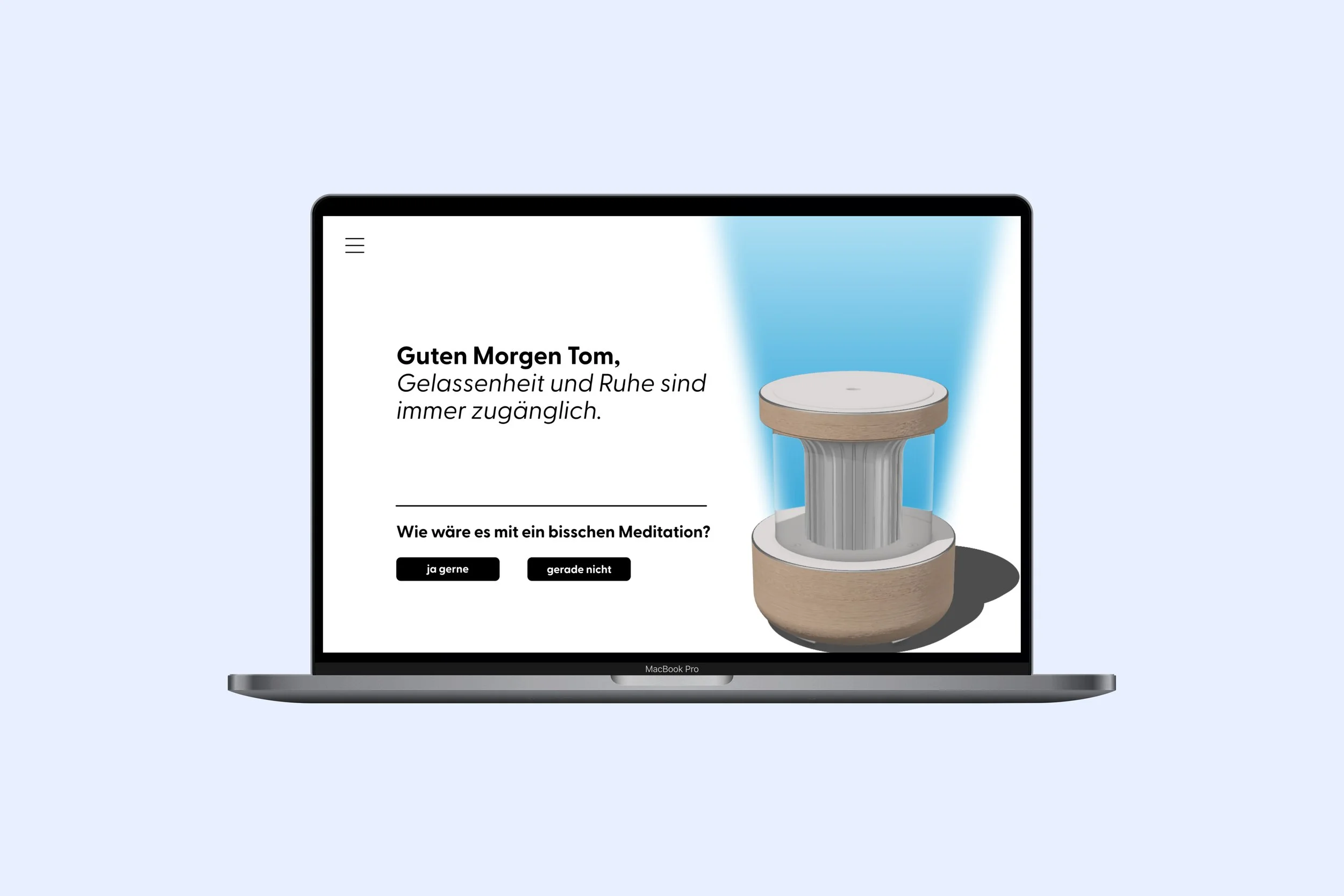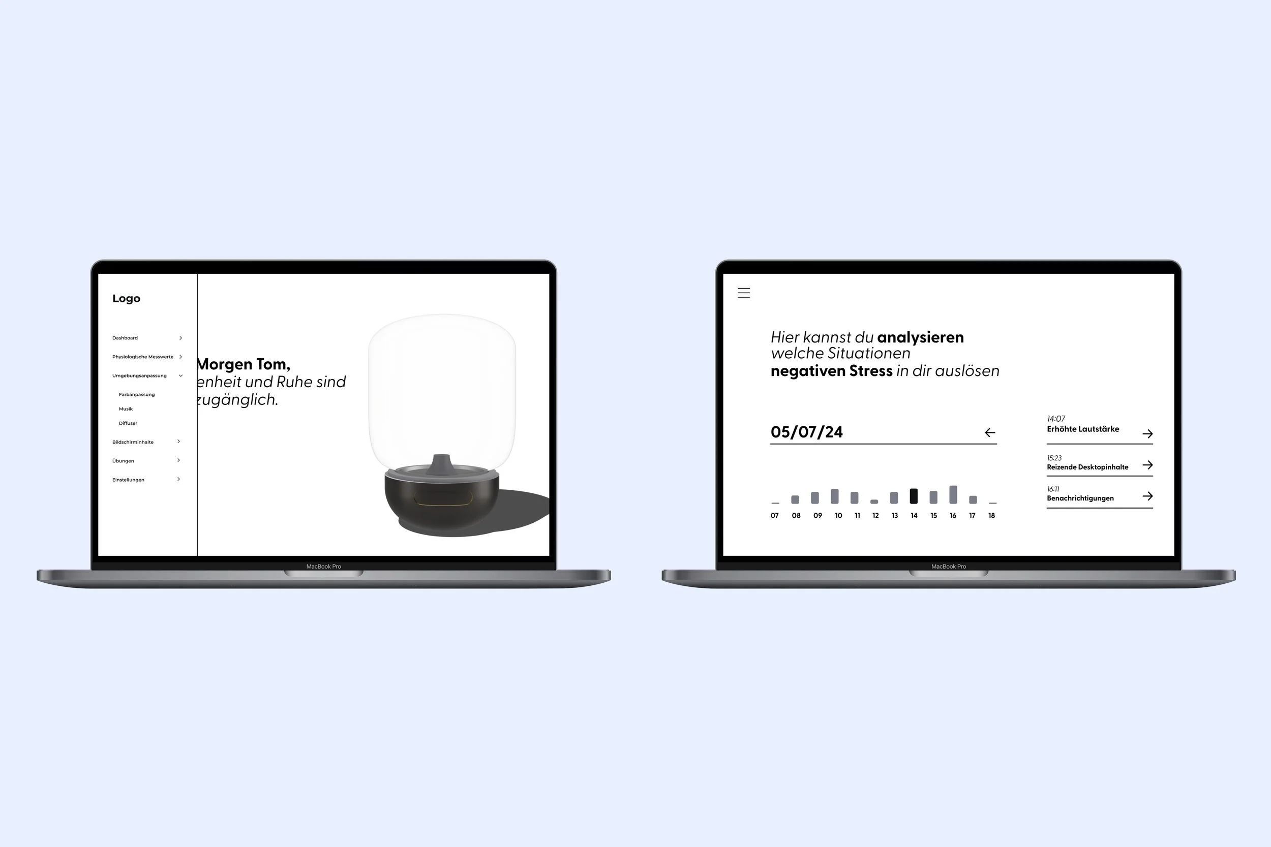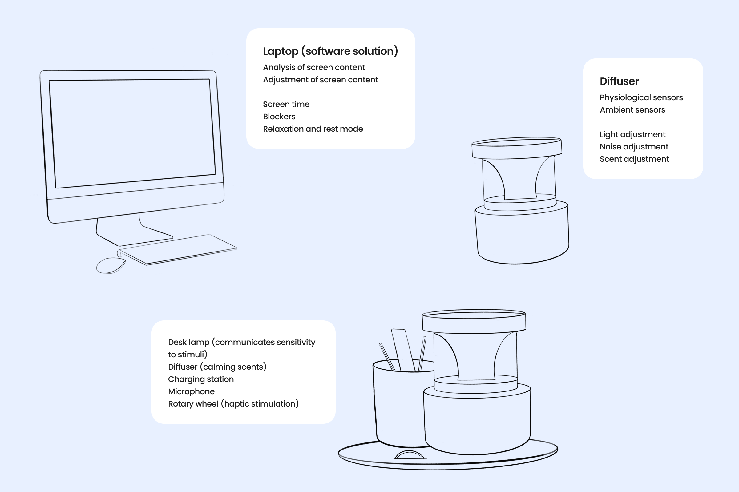 The final concept we developed consists of two main components: the digital software solution on the laptop and the physical diffuser which is placed next to it. The software's task is to analyse the screen content and adapt it to our users, for example by blocking certain content. The diffuser has built-in physiological and ambient sensors, such as light adjustments, a noise regulator and color adjustments.