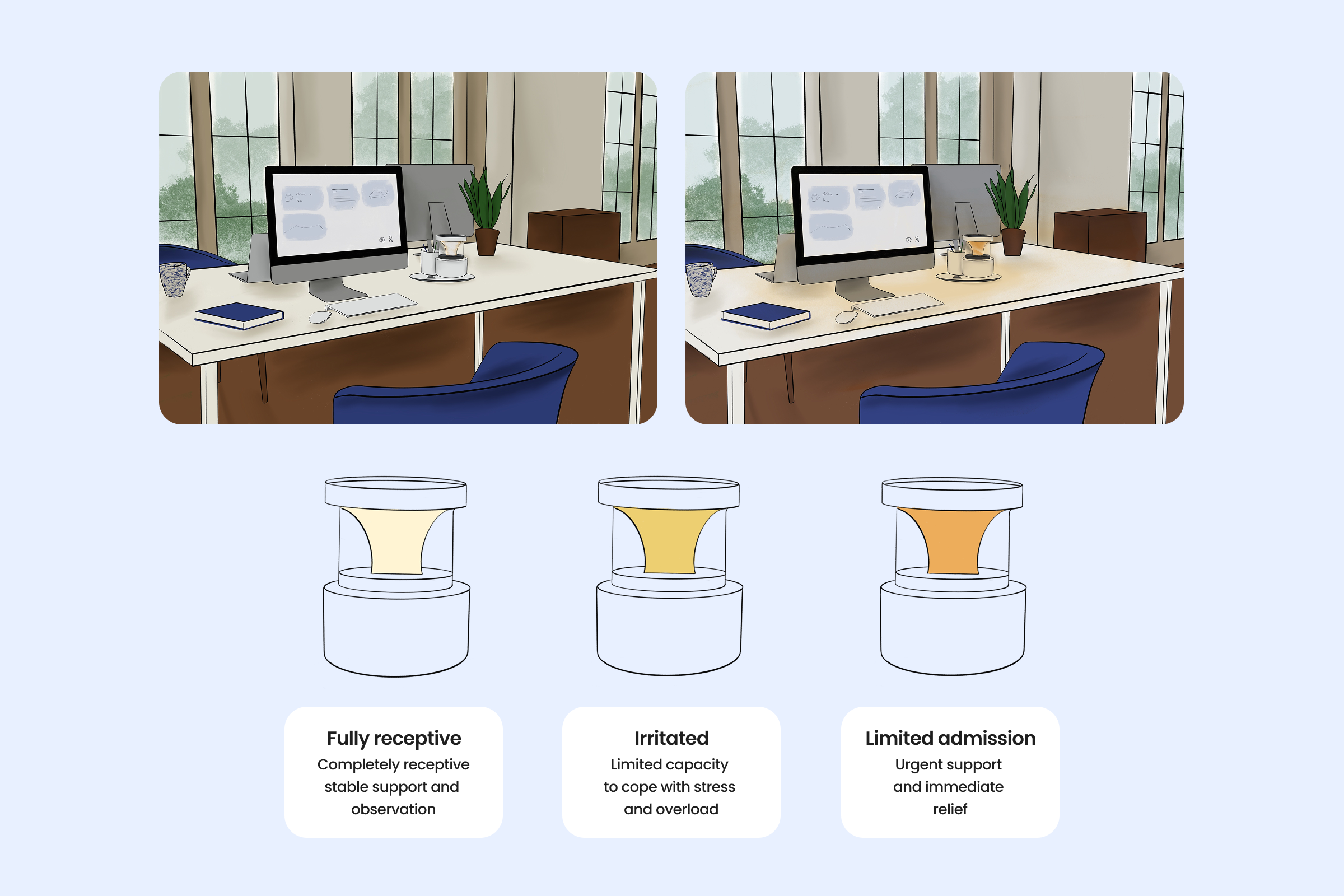 Through our research and self-study, we have come to realise that sensory overload is not only caused by external factors such as noise or light, but by the complex interplay between our environment, technology and personal perception. Each person reacts differently to stimuli, depending on their current state of mind, workload and context. We have learned that effective solutions must therefore adapt dynamically to these changing conditions, rather than simply reducing stimuli. True balance is achieved when users become aware of their sensory limits and can consciously navigate between sensory overload and tranquillity.